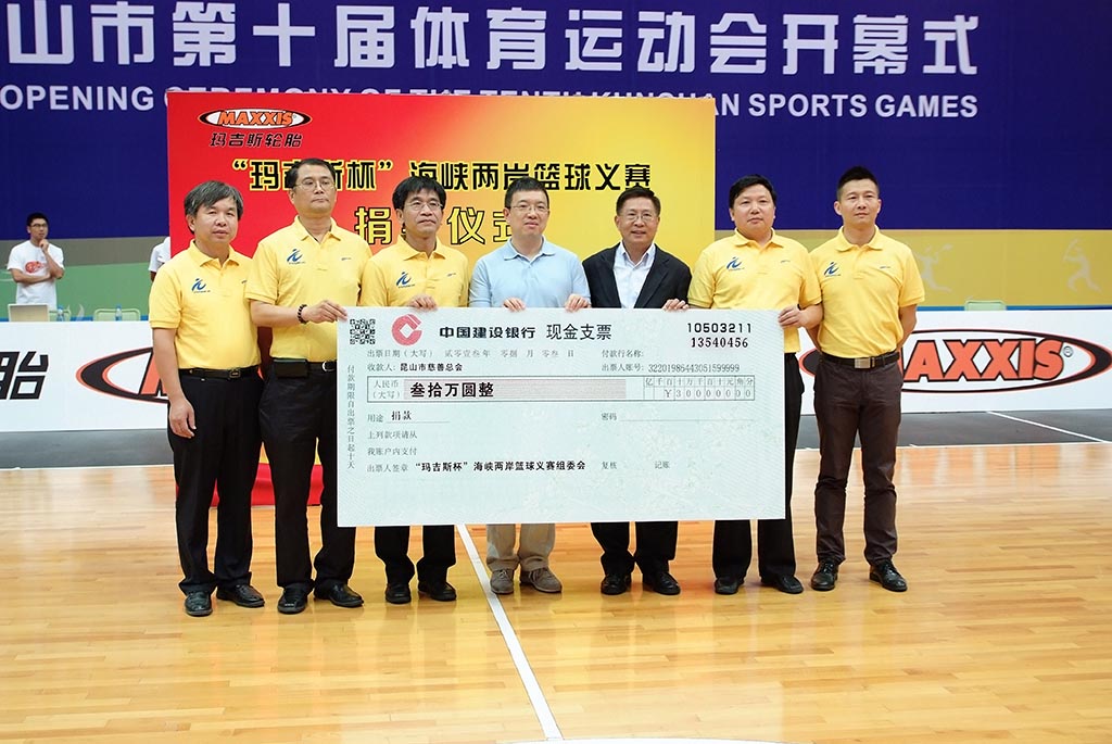 本場比賽不僅是海峽兩岸的一次精彩籃球?qū)Q,更是一次公益盛會(huì),中場環(huán)節(jié),組委會(huì)特別安排了公益捐款環(huán)節(jié),作為本次比賽的冠名贊助商,瑪吉斯輪胎代表正新橡膠(中國)有限公司攜手昆山市臺(tái)辦、昆山市陸家鎮(zhèn)人民政府、昆山市體育中心發(fā)展有限公司、上?,敿龟?duì)、臺(tái)灣裕隆納智捷隊(duì)向昆山市慈善總會(huì)捐贈(zèng)了本次比賽籌集的三十萬元善款。本次比賽的兩支球隊(duì)總經(jīng)理分別致辭,上?,敿鼓谢@總經(jīng)理章明基表示:“十分高興能夠參加本次‘瑪吉斯杯’海峽兩岸籃球義賽,同時(shí)也十分榮幸地參與到昆山市第十屆體育運(yùn)動(dòng)會(huì)的開幕儀式當(dāng)中,我們與裕隆隊(duì)可謂是老朋友了,我們隊(duì)中的曾文鼎便出自裕隆。希望大家享受今天的比賽,同時(shí)感謝大家對(duì)昆山市第十屆體育運(yùn)動(dòng)會(huì)的支持,以及公益事業(yè)的支持。”裕隆隊(duì)總經(jīng)理江育誠則表示,今后希望多參加這樣海峽兩岸的體育、文化交流。隨后此次義賽組委會(huì)代表昆山臺(tái)協(xié)會(huì)副會(huì)長游明輝先生向慈善總會(huì)轉(zhuǎn)交慈善支票,此時(shí),場下掌聲如雷鳴般響起,將本場比賽的氣氛推向了高潮。